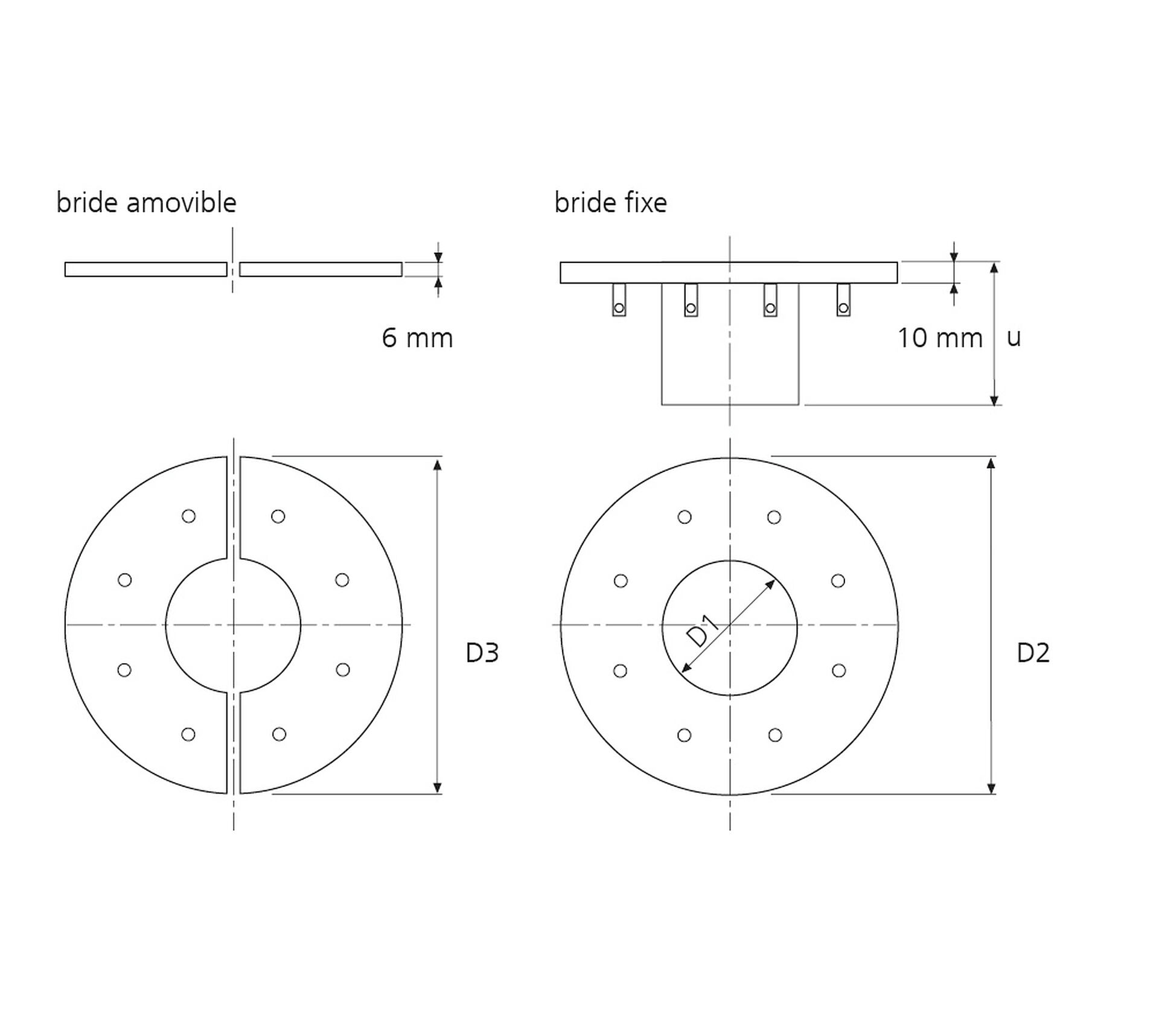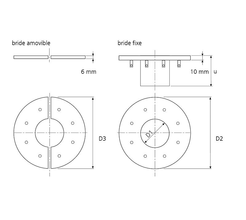 D1: Gaine Øi, D2: Bride fixe Ø, D3: Bride amovible Ø