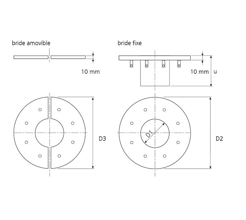 D1: Gaine Øi, D2: Bride fixe Ø, D3: Bride amovible Ø